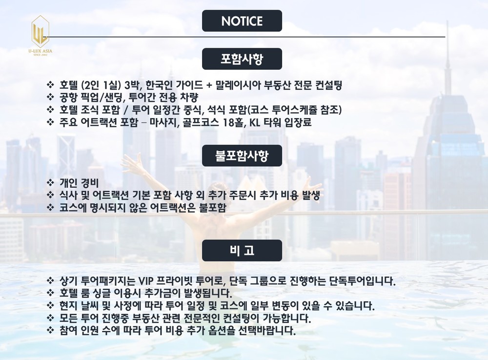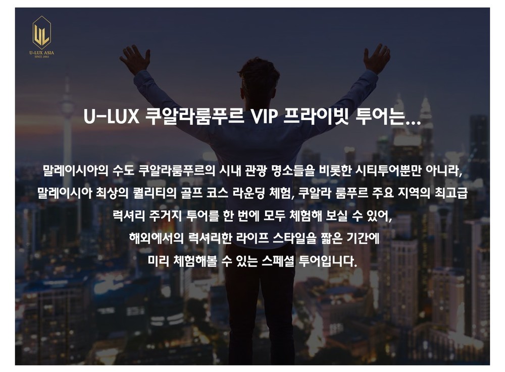 쿠알라룸푸르 최고의 호텔과 관광 명소 투어뿐 아니라 세계적으로 손꼽히는 최고급 부동산들을 둘러보고 최고의 명품 골프장 라운딩까지, 럭셔리한 라이프스타일을 미리 체험하는 VIP를 위한 스페셜 투어